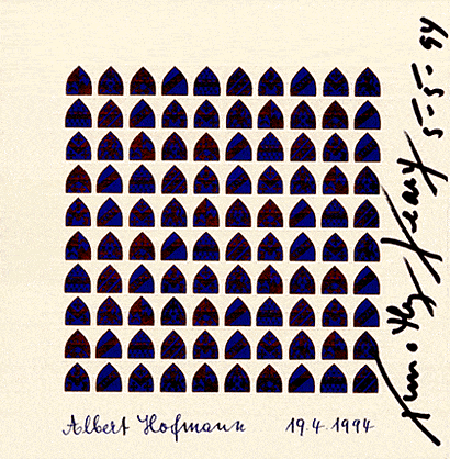 The Holy Grail edition was a collaboration between blotter art collector Mark McCloud, author Tom Lyttle and Robert Demarest, a rare book collector. Approximately 25 pieces of Kevin Barron's Heraldic Shields blotter art were brought to Dr. Albert Hofmann, the Sandoz chemist who'd discovered LSD. Dr Hofmann gifted one print and shipped back the rest. About twenty of those were then signed by Timothy Leary and most of those were distributed amongst Lyttle, McCloud and Demarest.